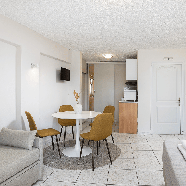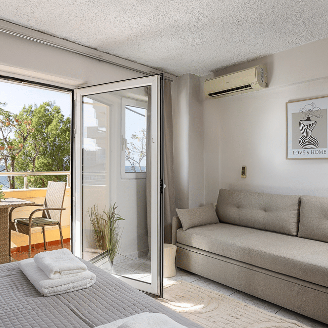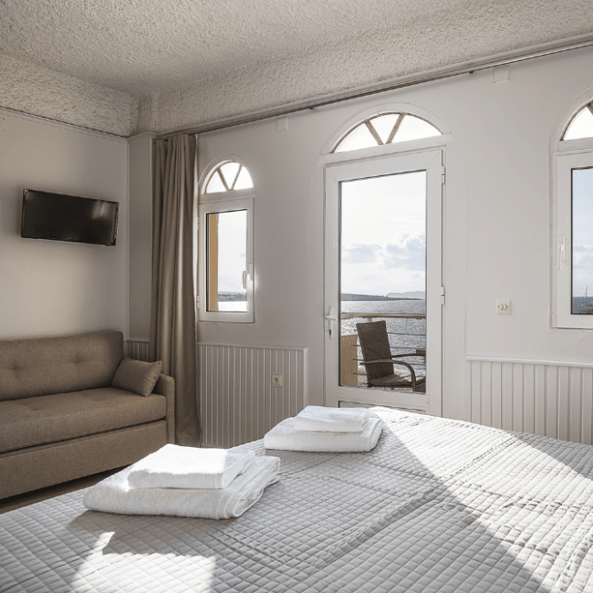 The Superior Room with Sea View is the most spacious option at Nea Chora Suites, comfortably accommodating up to four guests. Designed for families or small groups, it features a double bed and a sofa bed, along with a private balcony overlooking the Cretan Sea. This room is the perfect spot to enjoy the sunset or start your morning with a coffee.
