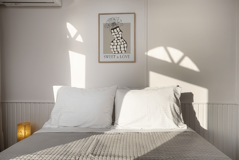 The room blends simplicity with comfort, featuring air conditioning, a flat-screen TV, complimentary Wi-Fi, and a refrigerator for added convenience. Functional storage and thoughtful touches ensure an easy and comfortable stay.