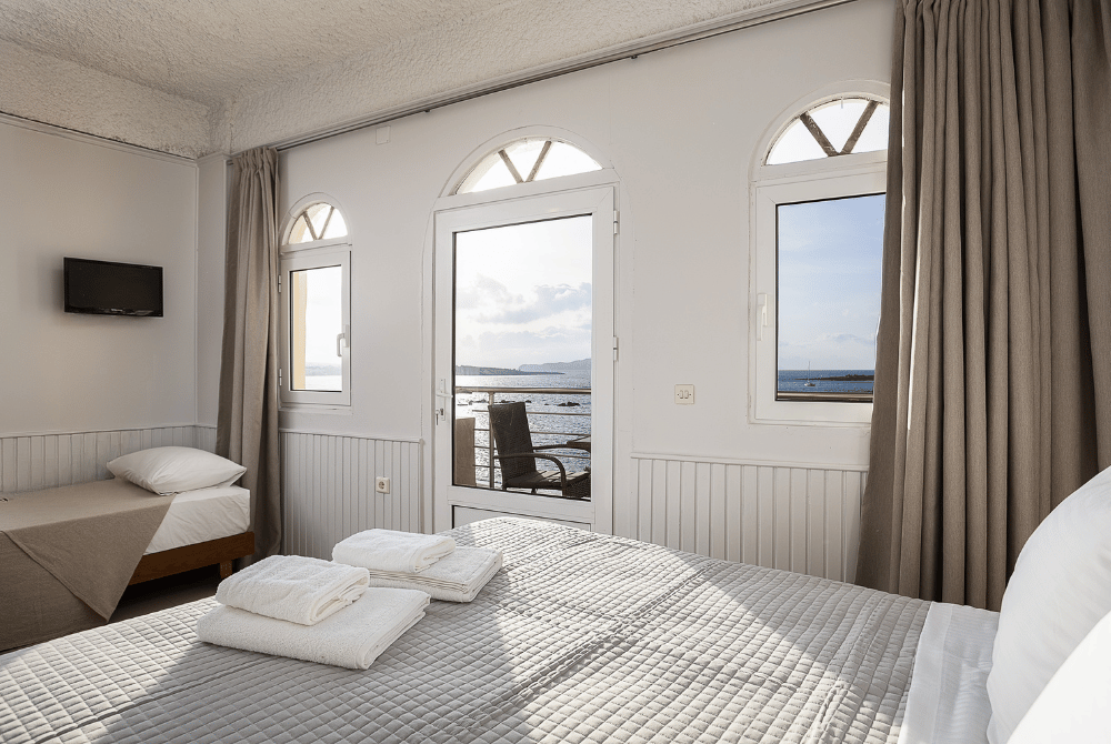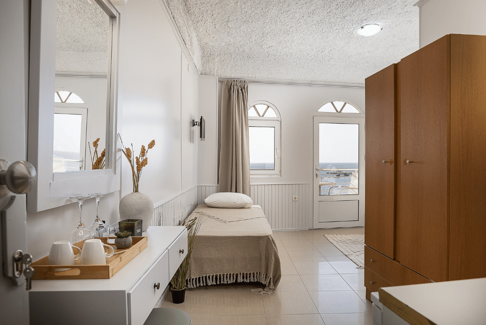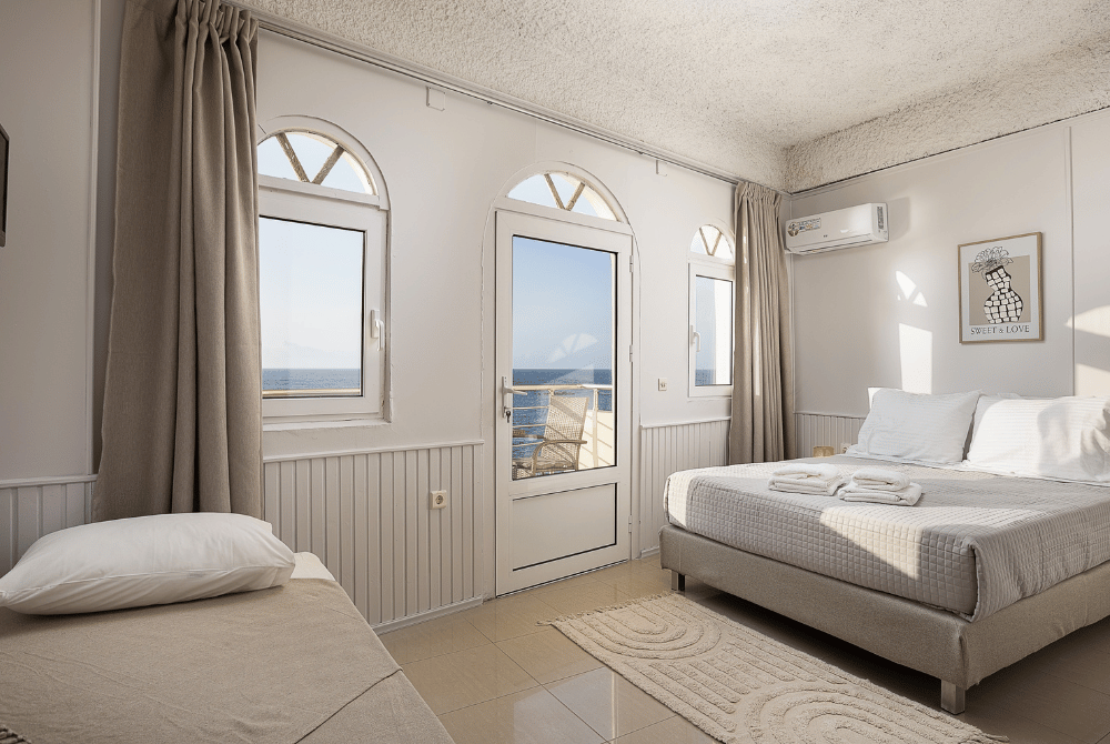 The Triple Room with Sea View is a bright and inviting space designed for up to three guests. With a double bed and an additional single bed, it’s ideal for small families or friends traveling together.