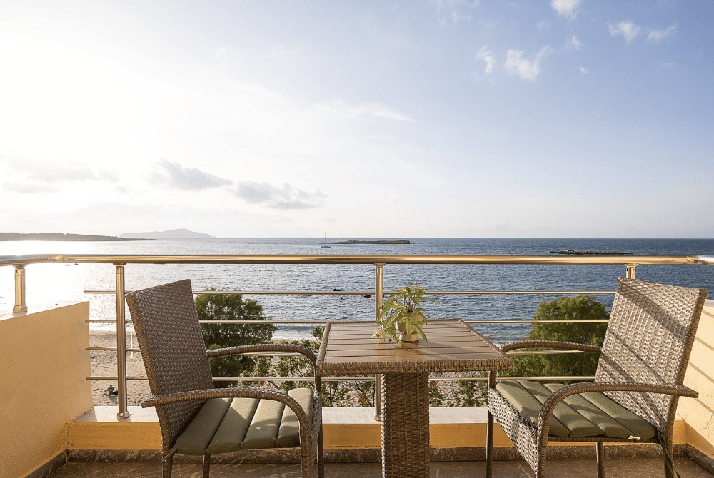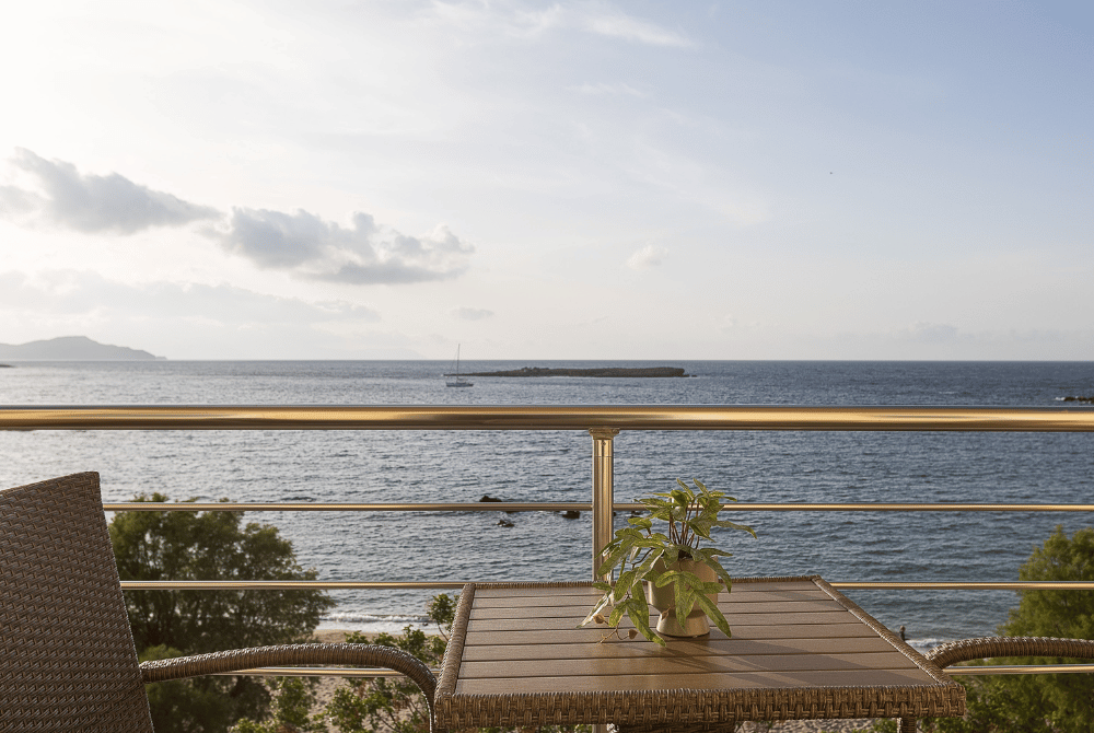 Just a few steps up the stairs leads to this tranquil space, where expansive windows and a private balcony open to captivating views of the Cretan Sea, creating a serene seaside atmosphere.